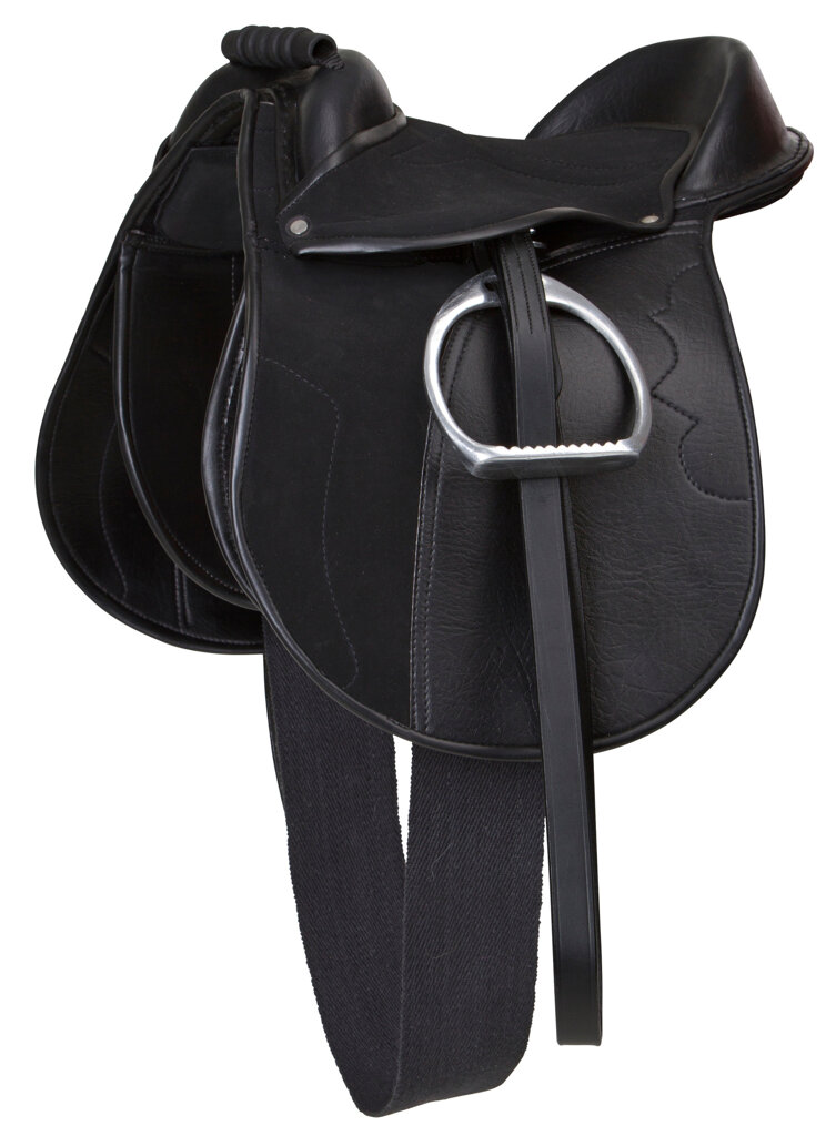 Kompletní sada skládající se ze sedla ze syntetické kůže, bavlněného podbřišníku, třmenů a třmenových řemenů. Díky hlubšímu posedlí a nastavitelným kolenním opěrkám je možné zajistit optimální sed jezdce. Díky úchytu v přední části je sedlo vhodné pro malé začátečníky.• lehké sedlo ze syntetické kůže