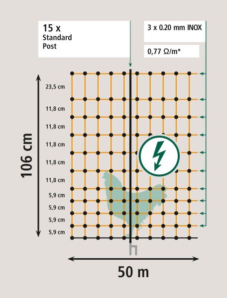 Síť pro drůbež PoultryNet, vodivá, výška 106 cm, délka 50 m, dvojitý hrot, oranžová