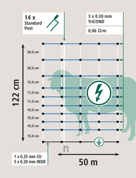 Síť pro ovce OviNet Maxi výška 122 cm, délka 50 m, dvojitý hrot, bílá/modrá