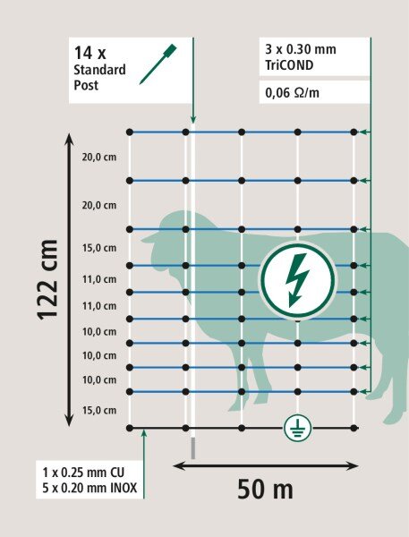 Síť pro ovce, kozy OviNet Maxi výška 122 cm, délka 50 m, jednoduchý hrot, bílá/modrá