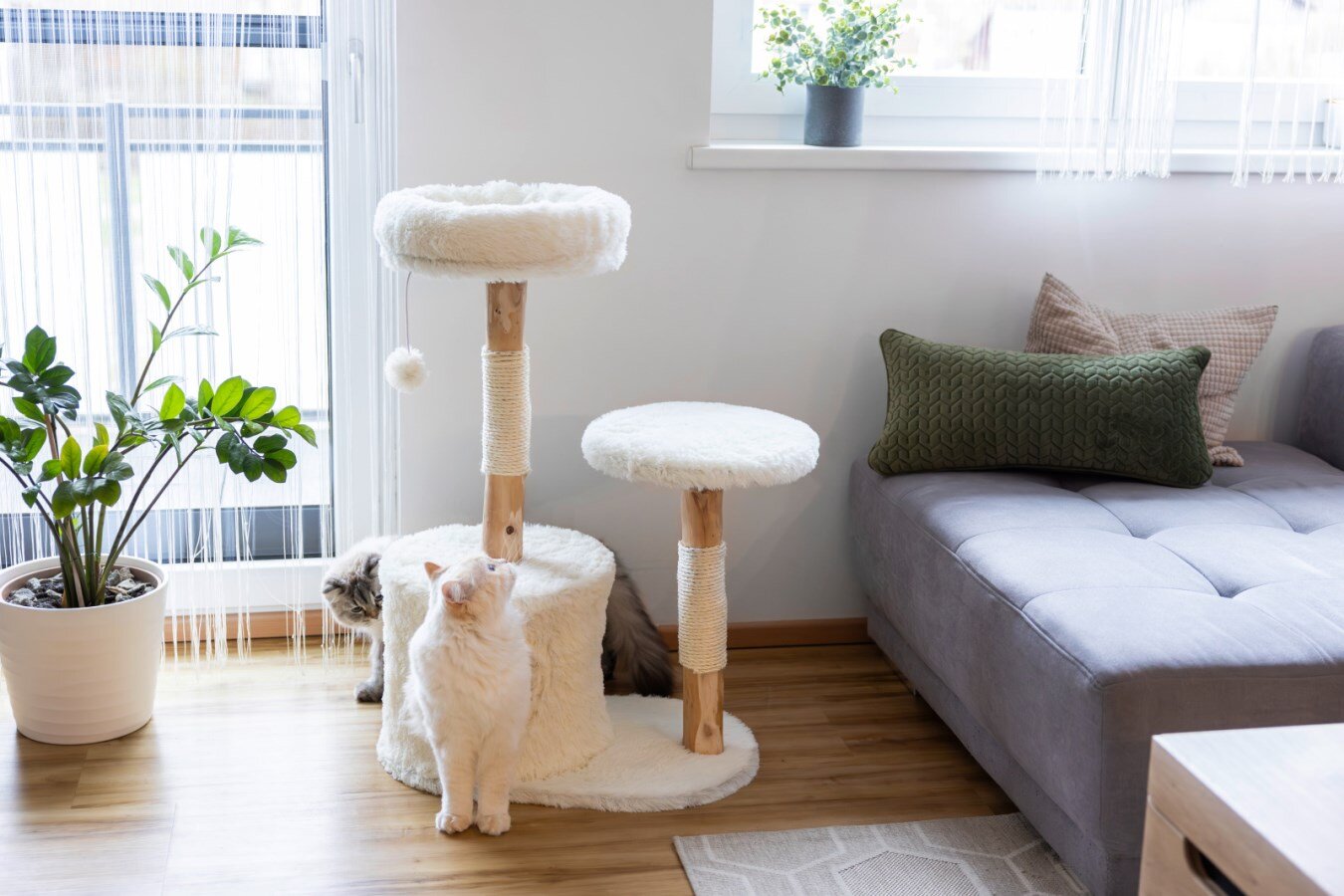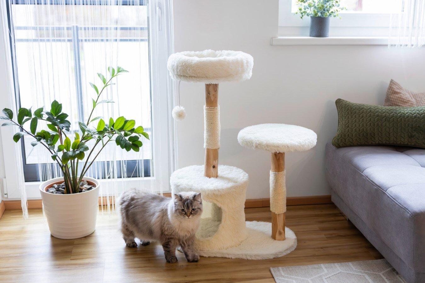 Kmeny z hrušňového dřeva jsou omotané sisalovými lany, která slouží k broušení drápků a podporují přirozené chování kočky. Škrabadlo nabízí několik měkkých, nadýchaných ploch na ležení, které poskytují ideální místo pro odpočinek i pozorování okolí. Součástí je také integrovaný plyšový hrací míček na elastickém popruhu, jenž podporuje aktivitu a zábavu.