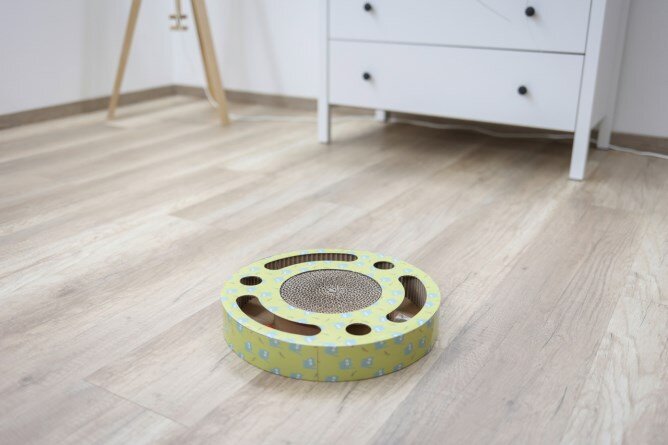 - kartonové škrabadlo pro kočky s plastovými míčky s rolničkami