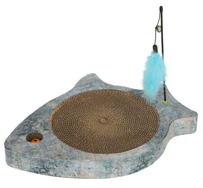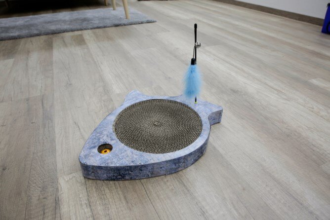 - kartonové škrabadlo pro kočky s plastovým míčkem a rolničkami s péřovou hračkou