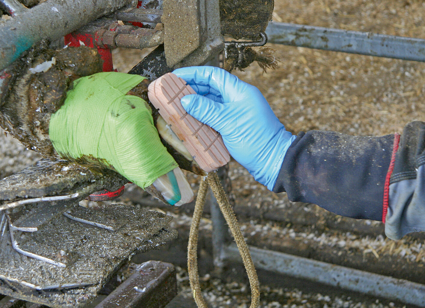 Jak jednoduché je použití: Sejměte těsnění z kartuše a připojte mixovací hrot. Vytlačte malé množství lepidla. To musí být provedeno tak, aby se obě složky smísily co nejúčinněji. Nyní na blok naneste lepidlo. Blok rychle položte na předem připravené, čisté a suché a zdravé kopyto. Po přibližně 30 sekundách bude lepidlo tuhnout a po přibližně 2–3 minutách může kopyto opět nést plnou váhu.