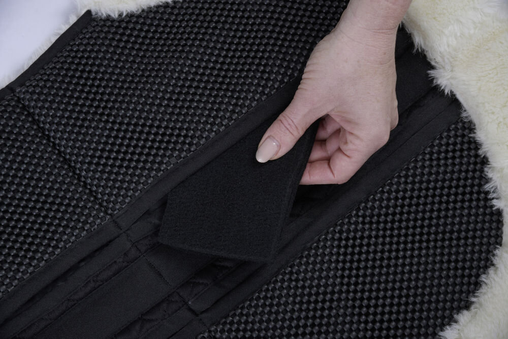 Tlumíci podložka pod sedlo s možností vyměnitelných plstěných podložek pro optimální docpání dle potřeb koně. Vrchní strana je z neklouzavého kuličkového neoprenu , spodní část podložky je z umělého beránku.• kapsa s možností výměny plstěných podložek
