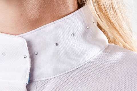 Dámské elegantní závodní triko z funkčního materiálu, zdobeno třpytivými kamínky Swarovski. Díky výbornému odvádění vlhkosti se i v horkých měsících triko nelepí na kůži