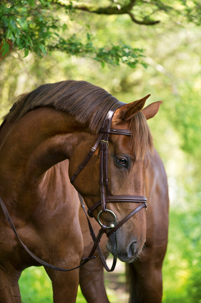 Klasická anglická uzdečka s kombinovaným nánosníkem, měkce podloženou čelenkou, nátylníkem a nánosníkem, dodávána včetně plátěných otěží se zarážkami. Čelenka i nánosník jsou dekorativně prošity bílou nití.• kožená uzdečka
