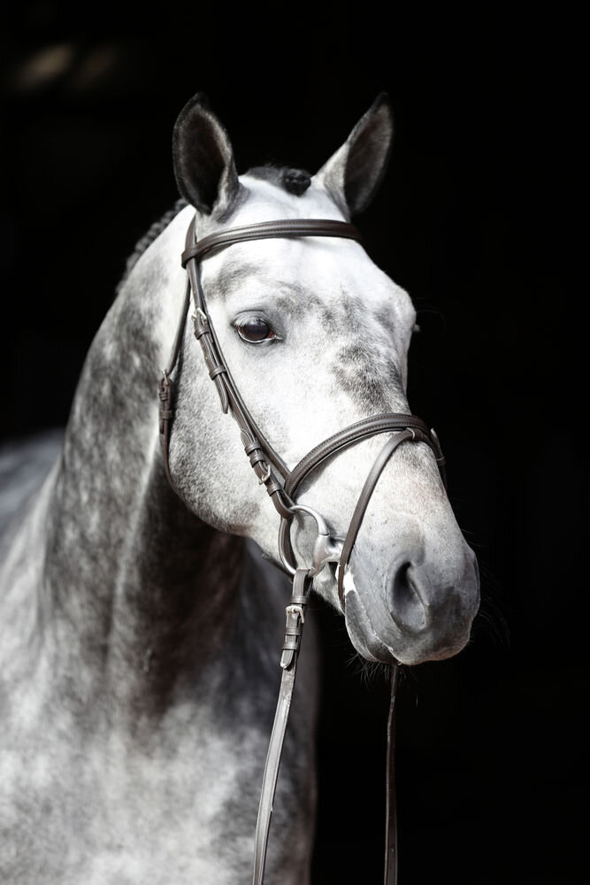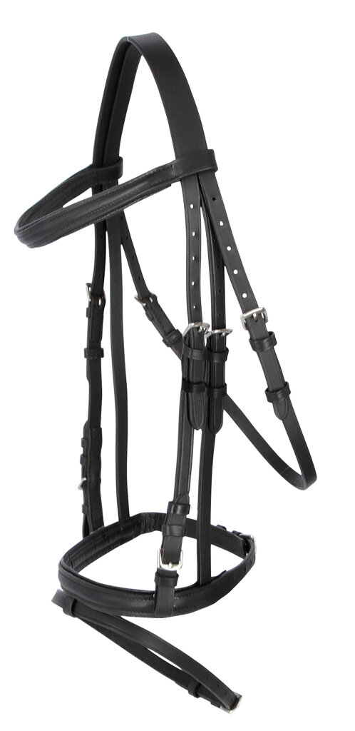 Klasická anglická uzdečka s kombinovaným nánosníkem, měkce podloženou čelenkou, nátylníkem a nánosníkem, dodávána včetně plátěných otěží se zarážkami.