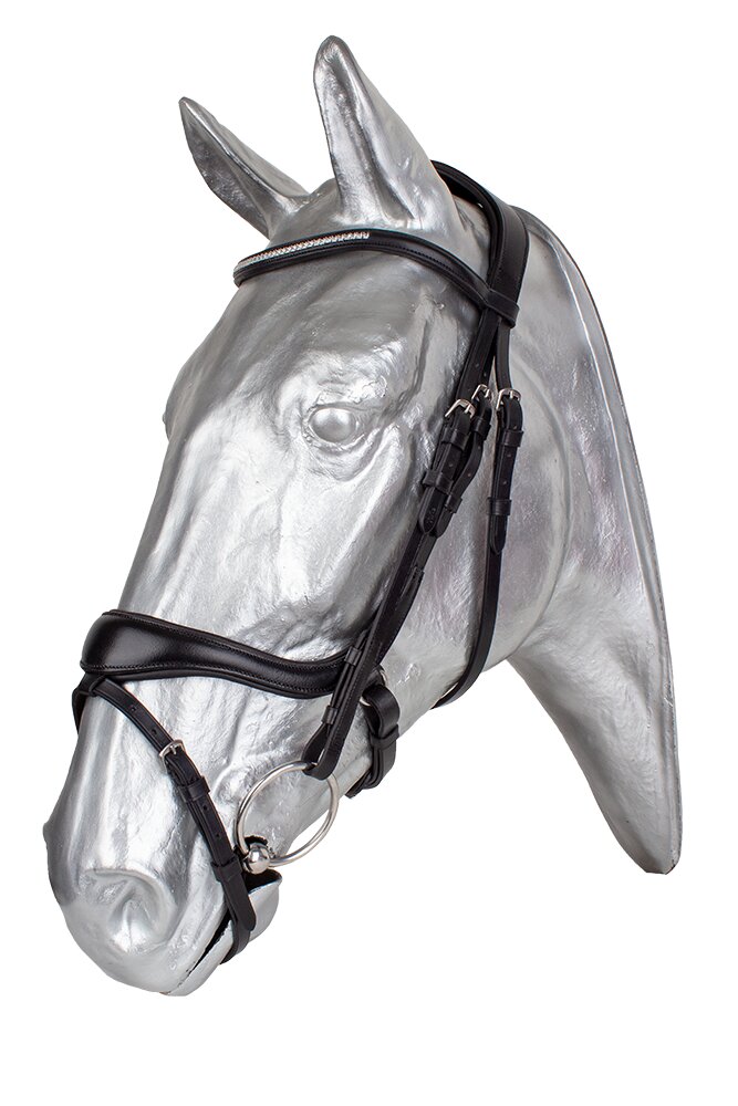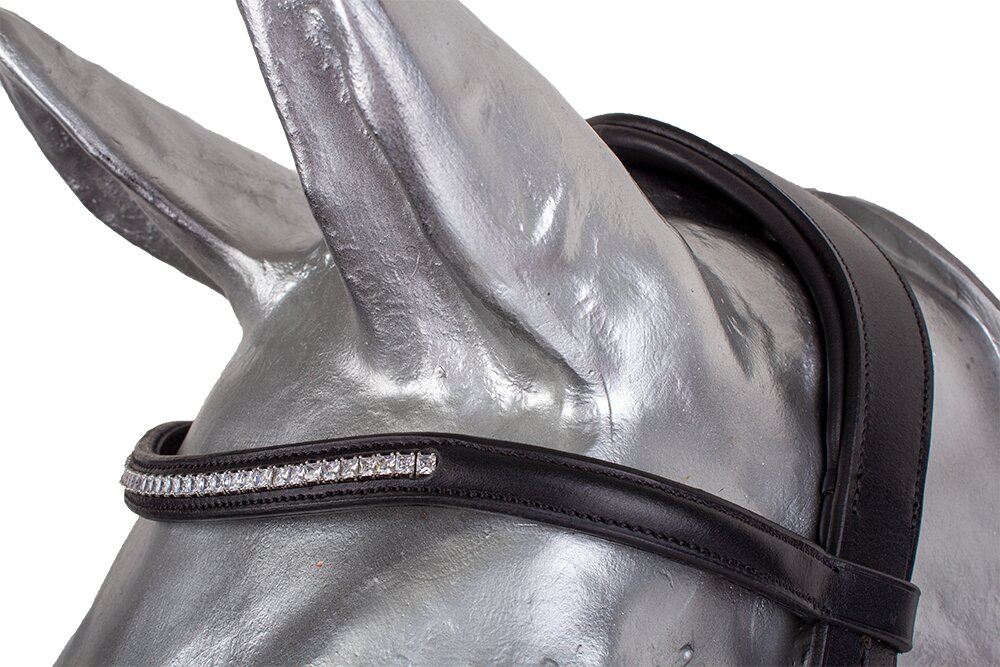 Anatomicky tvarovaná uzdečka s elegantní čelenkou zbobenou kamínky. Uzdečka má speciálně tvarovaný nánosník, který minimalizuje tlak na hlavní obličejové nervy.