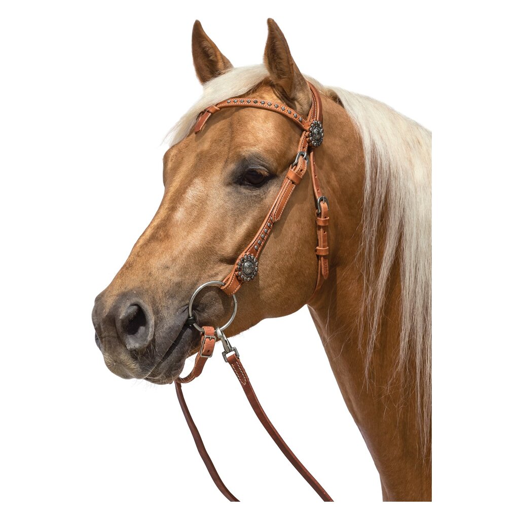 Westernová uzdečka z nejlepší hovězí kůže s bílým prosšitím, vázanou čelenkou na uzel, ozdobnými nýty a conchy. Lehká výměna udidla díky šroubovacímu systému Chicago.• vysoce kvalitní hovězí kůže