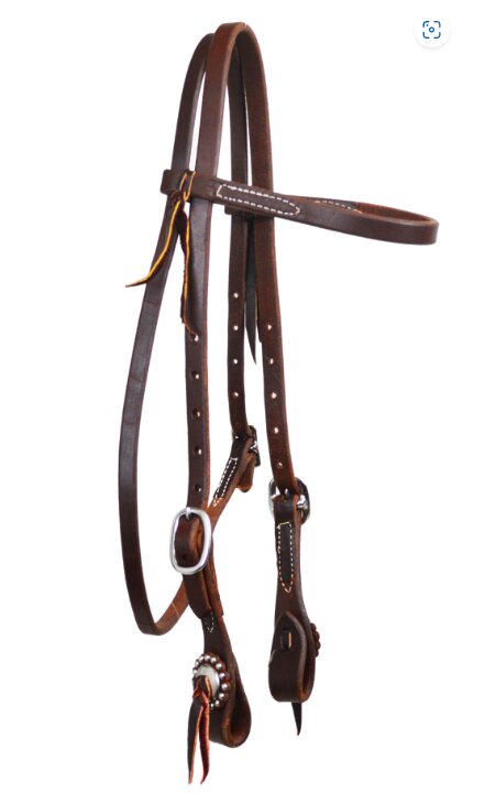 Westernová uzdečka Paul Taylor z vysoce kvalitní olejované kůže, s klasickou čelenkou, nerezovým kováním, zdobena conchy a koncovkami na vázání.• uzdečka s klasickou čelenkou