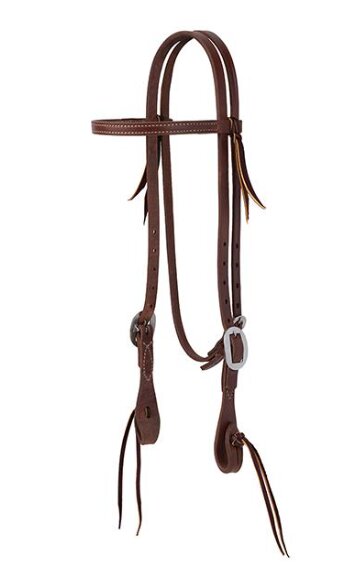 Westernová uzdečka WeaverLeather z vysoce odolné, olejované kůže Hermann Oak®s nerezovým kováním, klasickou čelenkou a s lehkou výměnou udidla pomocí uzlíků na konci lícnice.