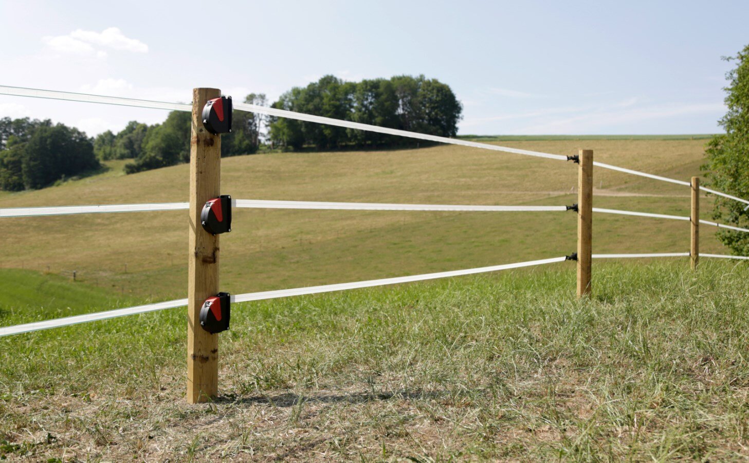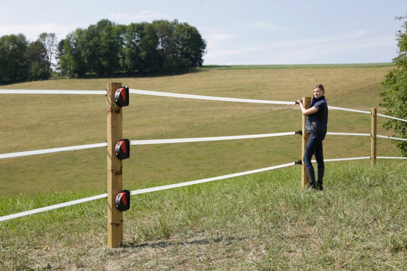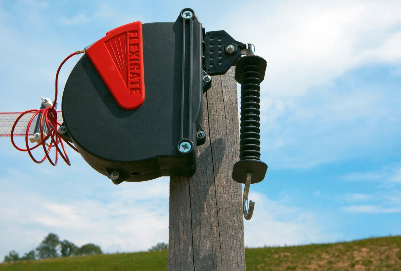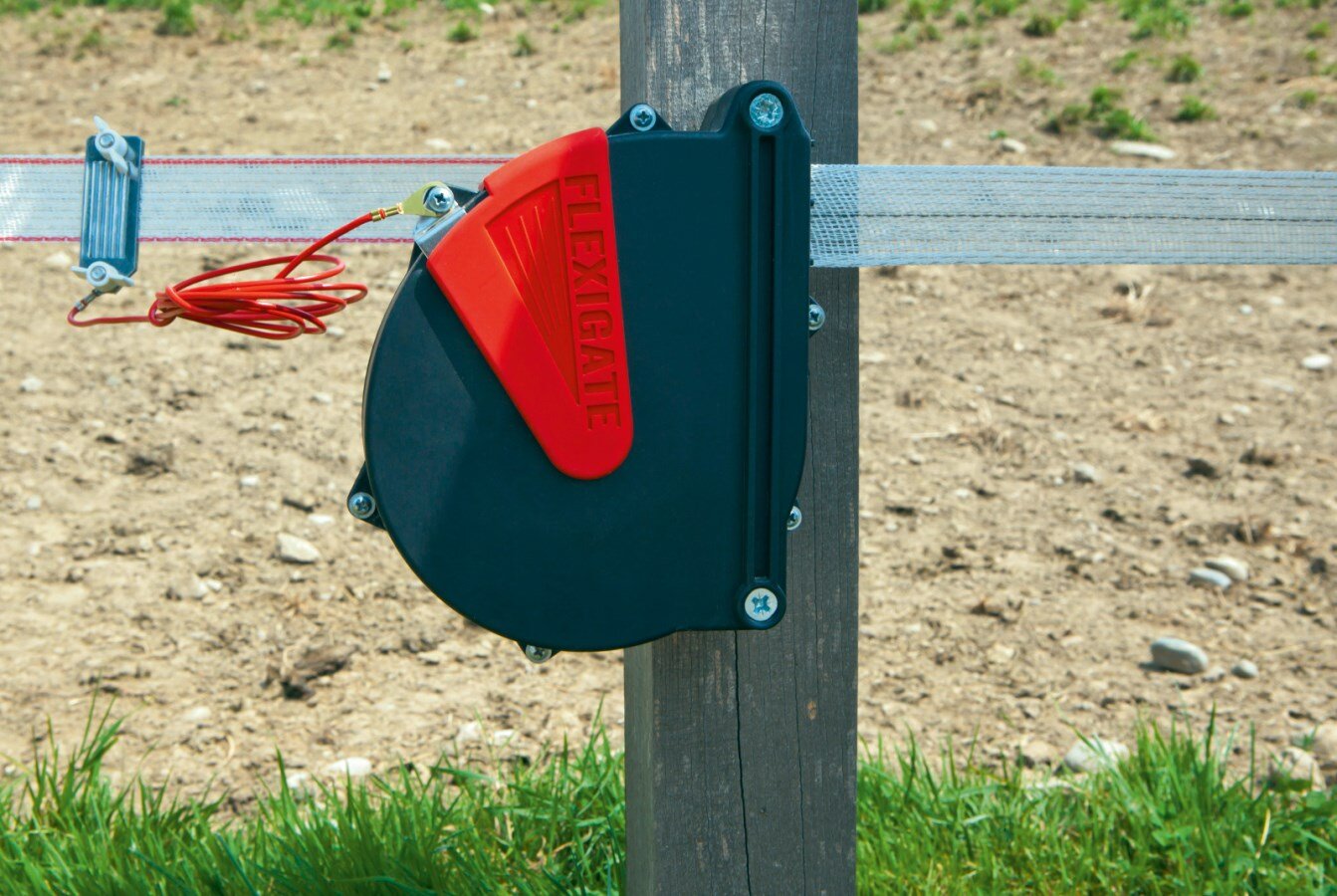 FlexiGate je praktické a bezpečné řešení pro vytvoření vstupu do elektrické ohrady. Díky pružnému mechanismu se páska automaticky navíjí, takže při otevření nepřekáží na zemi a neznečišťuje se. Páska o šířce 40 mm zaručuje výbornou viditelnost pro zvířata i na větší vzdálenost, což snižuje riziko prorážení ohrady.