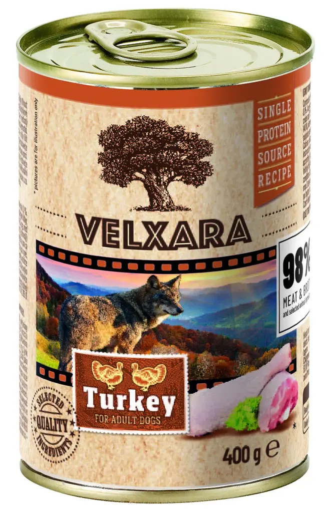 Vlhké monoproteinové krmivo s krůtím masem je určeno pro psy všech plemen s normální aktivitou. Konzervy pro psy Velxara jsou bohaté na maso a další masové produkty vč. vývaru. Krmivo je vyrobeno bez obilovin, lepku a sóji. Pro silné kosti a zuby je složení obohaceno o vitamín D3. Krmení je dále doplněno o vitamín E, který podporuje správnou funkci imunitního systému, lněný olej a zinek pro zdraví pokožky a perfektní kvalitu srsti a také o celulózu, který podporuje zdraví trávicího traktu.