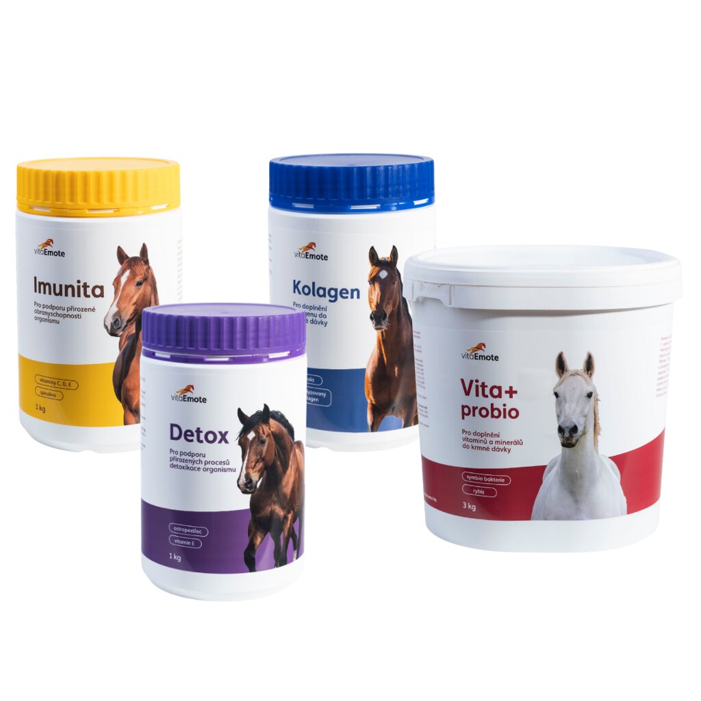 Komplexní péče pro zdraví, kondici a vitalitu dospělých koní v jednom balíčku. Sada VitaEmote – Dospělí koně 1 obsahuje čtyři prémiové doplňky, které dohromady podporují imunitní systém, trávení, detoxikaci i pohybový aparát.