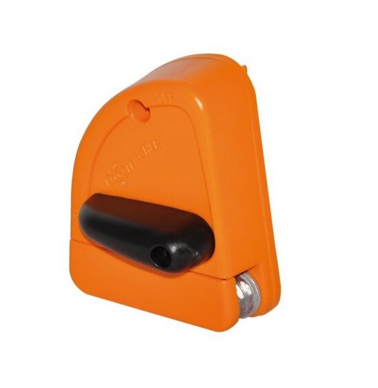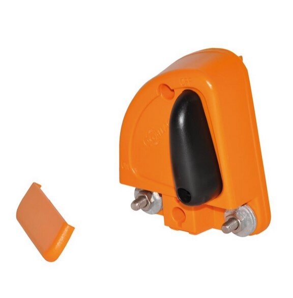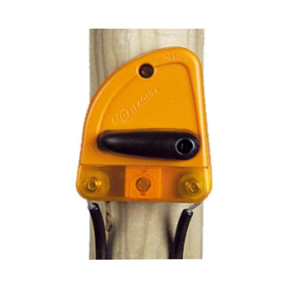 Vypínač se instaluje přímo do elektrického oplocení a upevní se pomocí dvou přiložených vrutů na dřevěný kůl.