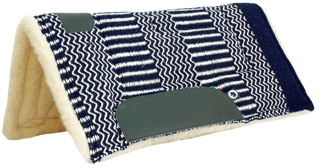 Westernová deka BURIONI pod sedlo s pravým beránkem vespod, svchní vlněnou navajo látkou a koženými výztuhami po bocích.• pravý beránek vespod deky