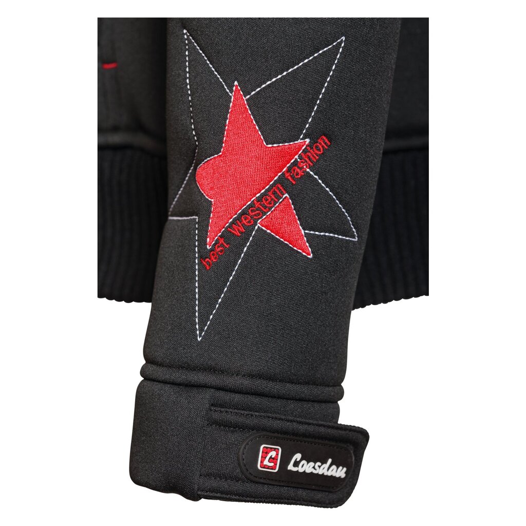 Volnočasová bunda od L-pro West vhodná pro každodenní použití. Bunda má hladký svršek z prodyšného materiálu, který odpuzuje vodu a vítr, je velmi odolný a zároveň snadno ošetřovatelný. Bunda je skvělá do chladných a větrných dní. Uvnitř bundy je super hřejivá podšívka. Bunda má obousměrný zip, kapuci s možností stažení, 2 vnější kapsy se zapínáním na zip, jednu vnitřní, výšivku na levém rukávu a termotisk na přední straně.• super bunda nejen pro jezdce