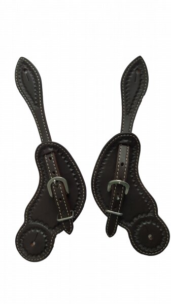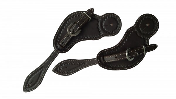 Široké řemínky na ostruhy POOL'S z vysoce kvalitní kůže a jemným zdobením po obvodu.Barva: tmavě hnědá